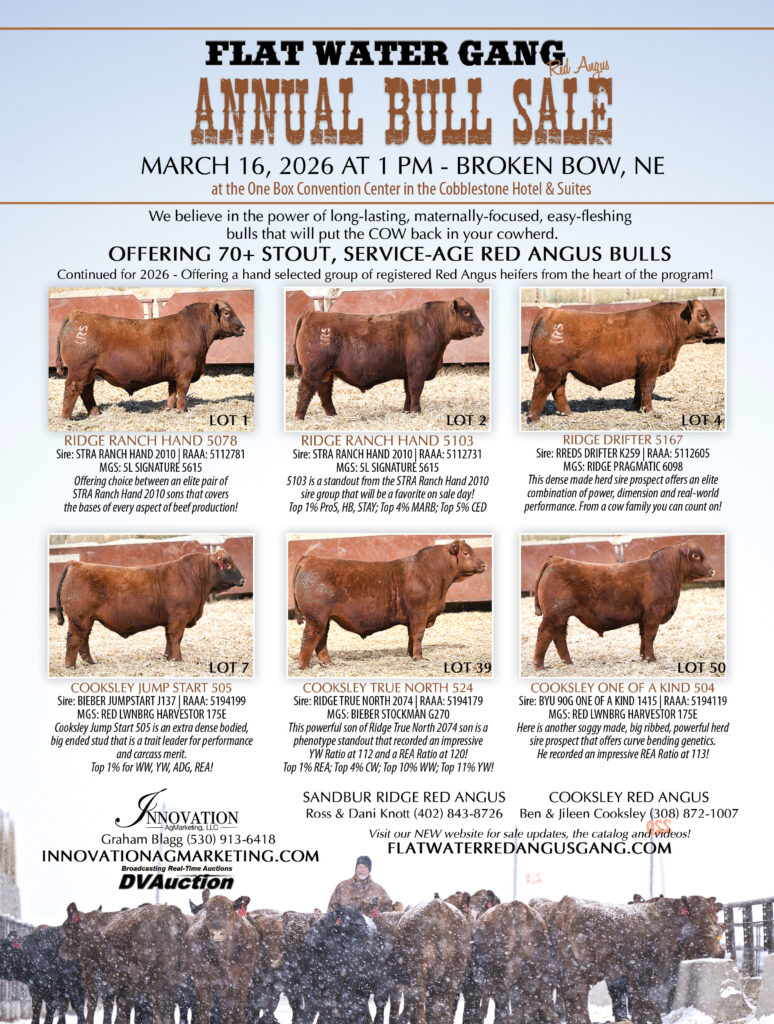 Our Annual Bull Sale is March 16, 2026, at 1 pm in Broken Bow, NE. This year, we are excited to offer registered Red Angus heifers as well as our selection of over 70 stout, service-age Red Angus Bulls.